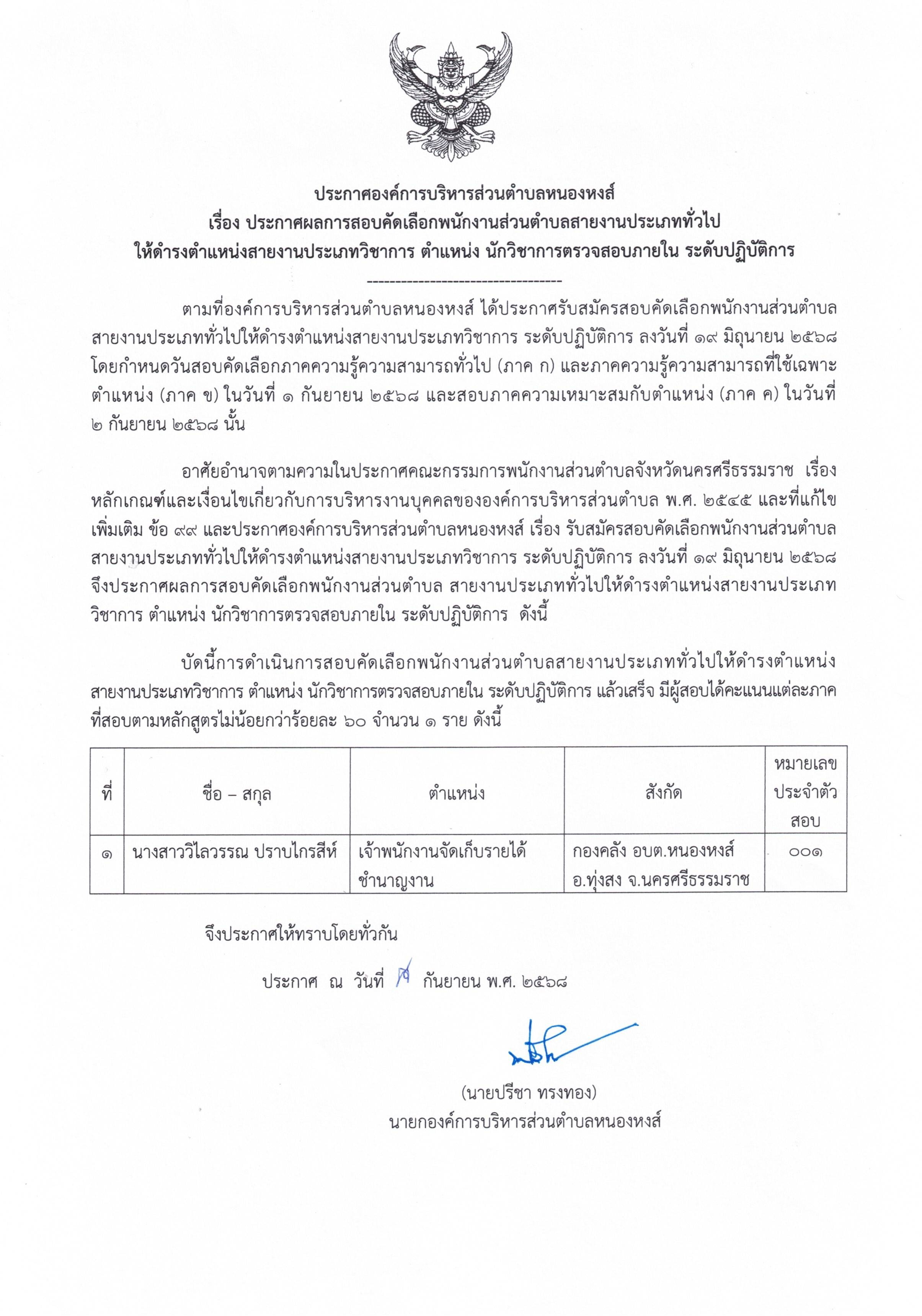 ประกาศองค์การบริหารส่วนตำบลหนองหงส์ รายชื่อผู้ผ่านการเลือกสรร |